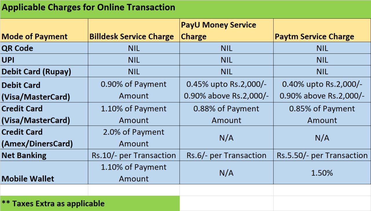 The applicable charges shall be levied when payment will be done through payment gateway (the list of charges). Please note that payment done through BBPS & UPI does not attract any charges.
